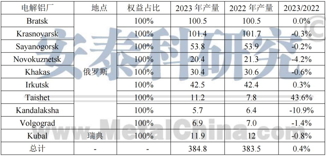 截至2023年底,俄铝在2个国家全资有10家电解铝厂,其中9家位于俄罗斯本土,产量占比高达96.9%。