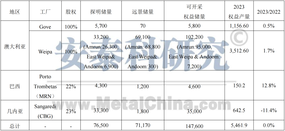 表5 2023年力拓氧化铝产量分布 单位:万吨