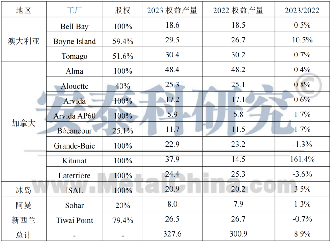 表6 2023年力拓电解铝产量分布 单位:万吨