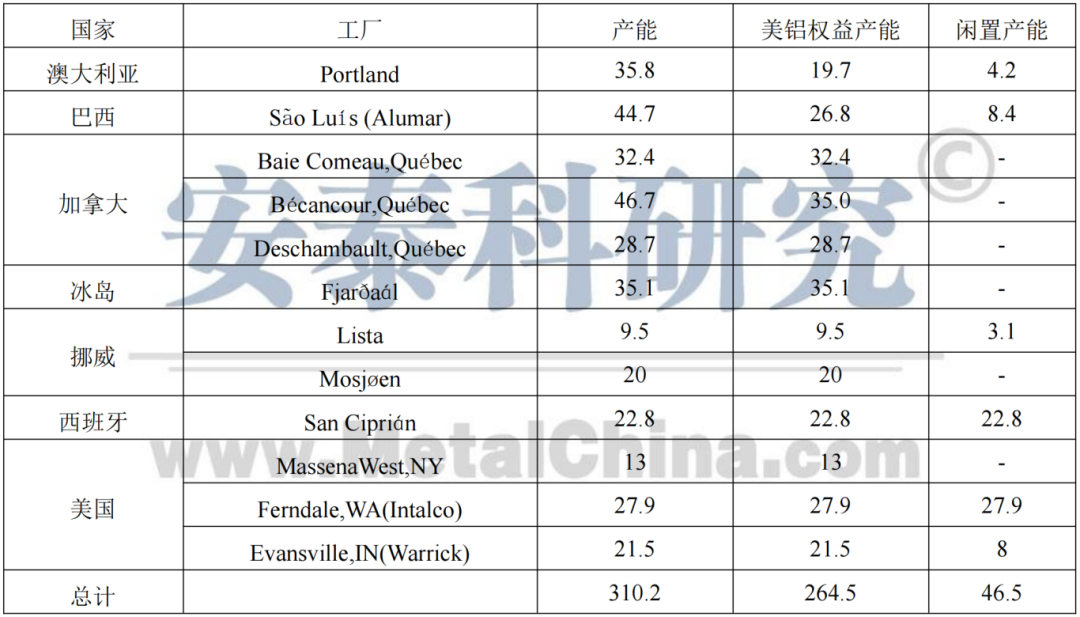 表9 海德鲁电解铝生产分布 单位:万吨/年