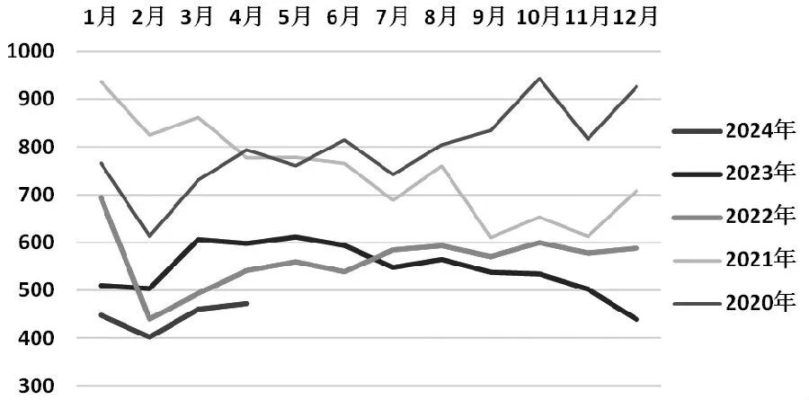 4月,国内电解铝的建成产能维持在4519万吨,这一数字在过去11个月中保持稳定。在产能等量或减量置换的政策背景下,建成产能将呈现逐步减少的趋势,并趋近于4500万吨。然而,4月的运行产能出现了小幅增长,增加了52万吨,至4262.07万吨,同时开工率增长了1.31%,达到94.31%,处于近5年同期最高水平。