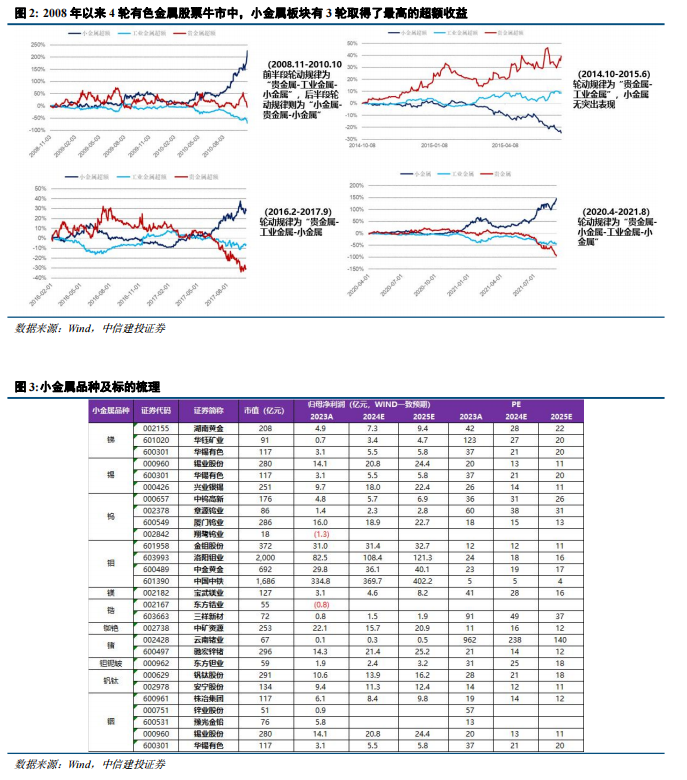 小金属板块的超额收益同样更大。我们选取2008年以来4轮有色金属股票牛市作为分析对象,子版块分别选取小金属、工业金属、贵金属的申万指数,并以“子版块累计涨幅-有色行业累计涨幅”作为对应超额收益率。总体而言,小金属板块在有色金属板块牛市期间最终实现的累计收益率较高。