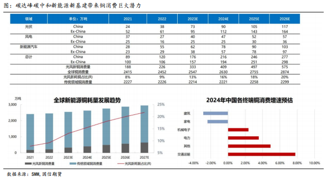 我国中国作为世界第一的铜消费国,贡献全球主要的铜消费增量,我国铜终端消费结构有别于全球。根据安泰科的分类,电力行业是国内精炼铜消费最主要的领域,占比高达50%左右,其次是家电、交通、建筑和电子。电力类消费中约有40%为建筑用电力电缆,中国铜需求和固定资产类投资完成额高度相关。因此铜为代表的大宗原材料的短期异动背后除了突发风险事件的短期因素刺激以外,更多是投资者对国内外货币政策与相关实体产业政策刺激预期的提前下注,而利好预期往往需要一段时间观察验证后才能证实或证伪,2024年作为“十四五”规划中间关键之年,铜真实消费需求的成色可重点聚焦电力投资用铜领域。