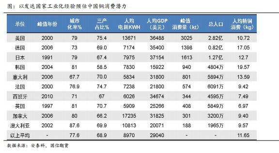 参照先行工业化国家的相关指标,通过对中国经济发展不平衡及人口因素,更多按照参照对象的低值进行预测和对比分析,时点预测如下:(1)人均GDP和三产,参照先行工业化国家低值1.6万美元,峰值约2027年达到;(2)城镇化率,参照人均铜消费量超过10kg的制造业发达国家均值76%,峰值约2030年达到;(3)三产占GDP比值,参照低值59%,峰值约2023年达到;(4)人均电耗,参照低值5834kwh,峰值约2024年达到。综合以上指标,中国铜消费峰值的保守预估时点在2025-2030年左右。