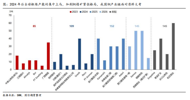 以有色铜铝产业链为例,2024年我国铜产业链上游供应扰动大幅增加,原材料紧缺预期推动价格飙升,面临海外资源供应不稳定,尤其是全球主要资源国矿物品位下降产量减少、资源保护政策等多因素挑战,导致全球资源保障威胁加大,而我国自身资源禀赋远远无法满足世界第一制造业大国的海量原材料需求,使得我国自身资源供应增量面临瓶颈,近三年来我国铜精矿为代表的有色金属产量增速持续降低,而作为全球最大的大宗商品消费国,在传统消费领域及新能源领域对铜等有色金属需求持续快速提升,尤其是在2024-2025年间我国以铜精矿为主要原料的铜粗炼产能快速扩张至全球产能的半壁江山导致供需错配加剧。
