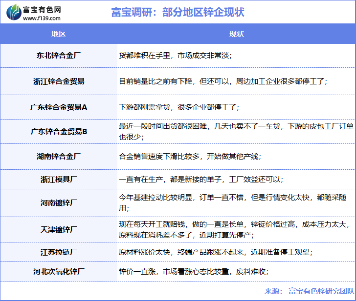 近期锌价久居高位,不少企业纷纷反馈原料成本上涨过快,但下游订单低迷,现货成交困难,更有不少企业停工观望,据富宝锌小组调研:
