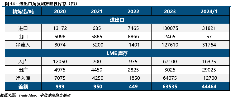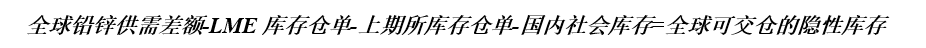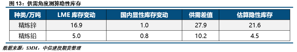 铅锌方面,站在全球市场的角度,全球铅锌冶炼与需求端产生的供需平衡差值即为潜在的库存量,其中一部分显性化交仓至交易所或社会库存中,另一部分则是我们需要推算的隐性库存。测算方法方面,我们将ILZSG(国际铅锌研究小组)的全球供需数据作为测算基础,并选取LME库存水位偏低的2023年初作为初始基准值。我们能公开获取到的显性库存值有LME库存仓单,上期所库存仓单及国内社会库存,因此将2023年以来的供需差值汇总即可得到潜在的累积交仓量,再将潜在的累积交仓量减去国内外显性库存即可得到隐性库存值。