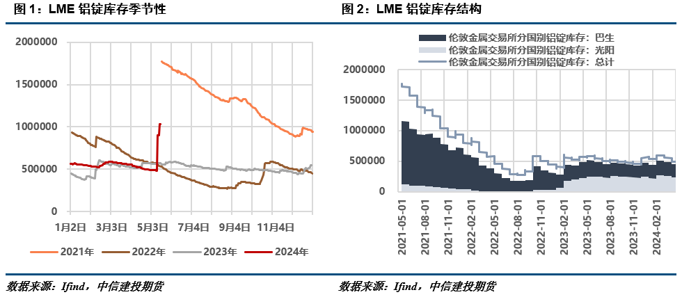 铝方面,5月10日集中交仓后,LME库存仓单大幅增加42.4万吨,目前LME铝库存已超出近两年峰值;结构上看,未交仓前巴生及光阳两个仓库各占据全球50%库存量,而此轮交仓后巴生仓库超过70%。单从生产角度考量,巴生仓库所位于的马来西亚铝产能较为有限,境内铝业龙头为Press Metal,2023年刚由76万吨提产为108万吨,除去本国消费后难以贡献如此天量。因此本轮交仓货源或多来自进口,自产可能偏低。