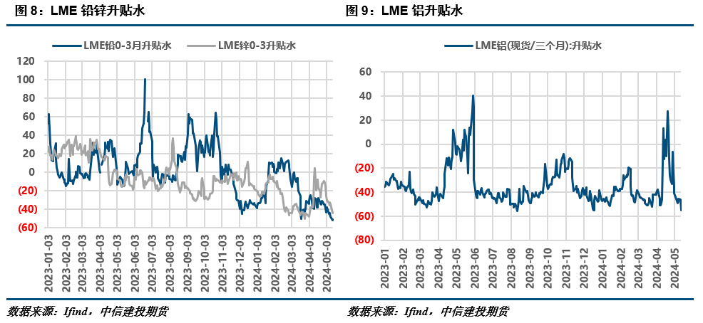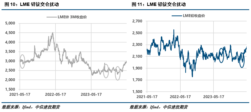 我们对近5年的新加坡进出口铅锌数量与LME出入库数量进行梳理,可发现铅锭交仓扰动在前四年相对较小,不过自去年末以来未交仓的隐性货源呈现陡增态势,也能较好地解释3月中旬集中交仓的扰动来源。而相比之下,锌锭虽然流动性更强,但亦是自23年底以来未交仓的隐性货源出现增长。将新加坡进出口铅锌数据及LME出入库数据作差额对比,测算可得自23年末以来新加坡境内滞留隐性铅锭货源近10万吨左右,锌锭12万吨左右,后续仍存在大额交仓的可能,隐性库存交仓或成为一大价格扰动风险。