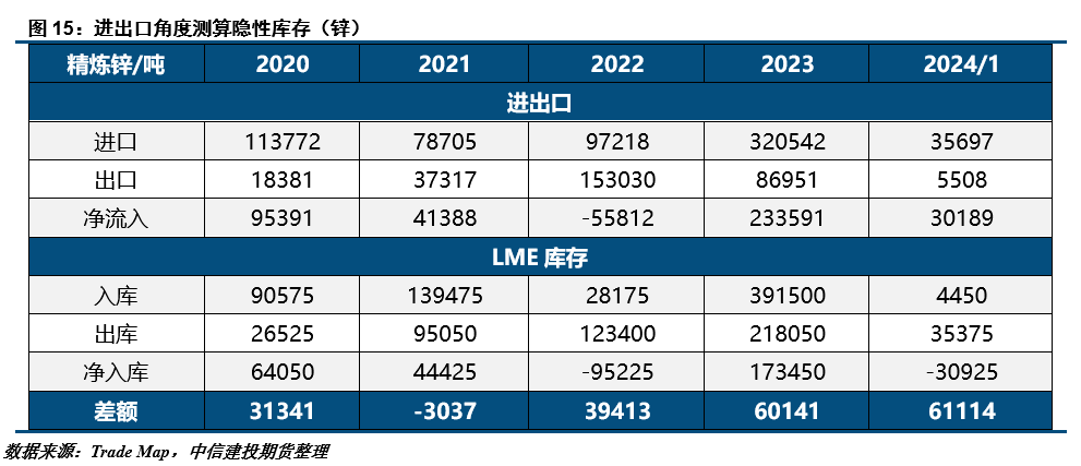 仅从新加坡自身出发,由于其作为港口国家主要承接贸易业务,进出口数额差值将表征其内部可流动的铅锌货源数量。因此将进出口差额与LME仓库铅锌存量再做差值,即可得到在新加坡境内仍可能交仓的隐性库存。