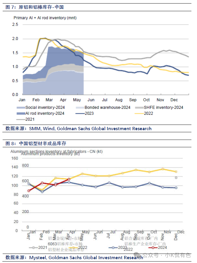 -我们估计原铝库存(包括铝棒)在最近几周减少了 0.02 万吨。加工产品库存大部分处于正常范围。