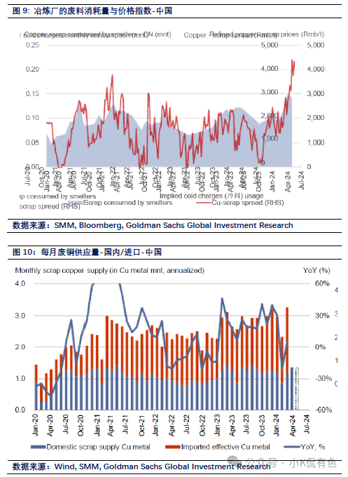 尽管精矿市场趋紧,但我们估计,由于精炼铜与废铜之间的价差扩大,中国冶炼厂 4 月/5 月的月度废铜消耗量较今年年初增加了 4-5 万吨。虽然没有数据显示中国有多少废铜库存,但从历史规律来看,冶炼厂废铜消耗量的增加可能会持续 6-9 个月。