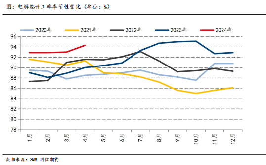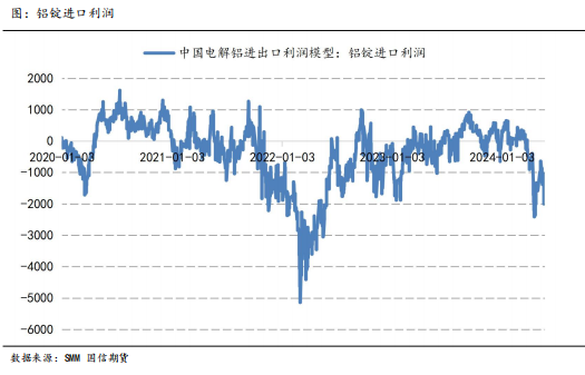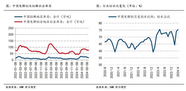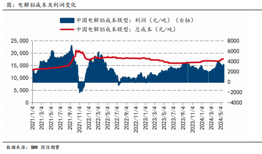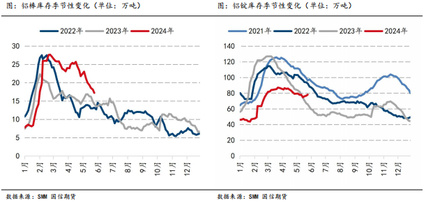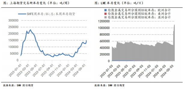 “五一”假期后,库存出现正常节后累库,随后再次转变为去库状态,但整体来看,铝锭去库并不十分顺畅,且去库速度不及往年同期,至5月末,铝锭库存水平已经高于2023年同期,此前铝锭长期处于过去五年历史同期最低位的优势有所削弱。据SMM数据,截至5月27日,铝锭库存为78.1万吨,较5月23日增加1.3万吨,连续累库,铝棒库存为17.21万吨,较5月23日下降0.9万吨,维持去库,铝锭的连续累库将对铝价上涨逐渐形成牵制。此外,此前伦铝库存暴增后,其库存变化也成为市场关注焦点,将是影响内外铝价的又一潜在风险因素,需要关注LME涉及俄铝仓单的规则动向。