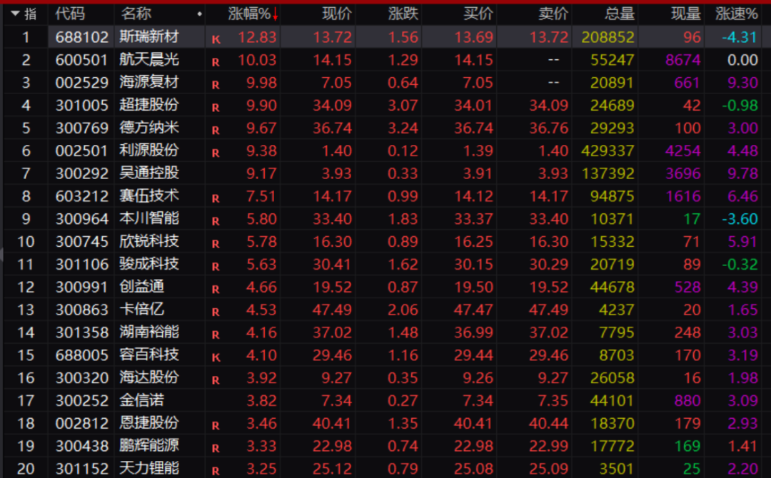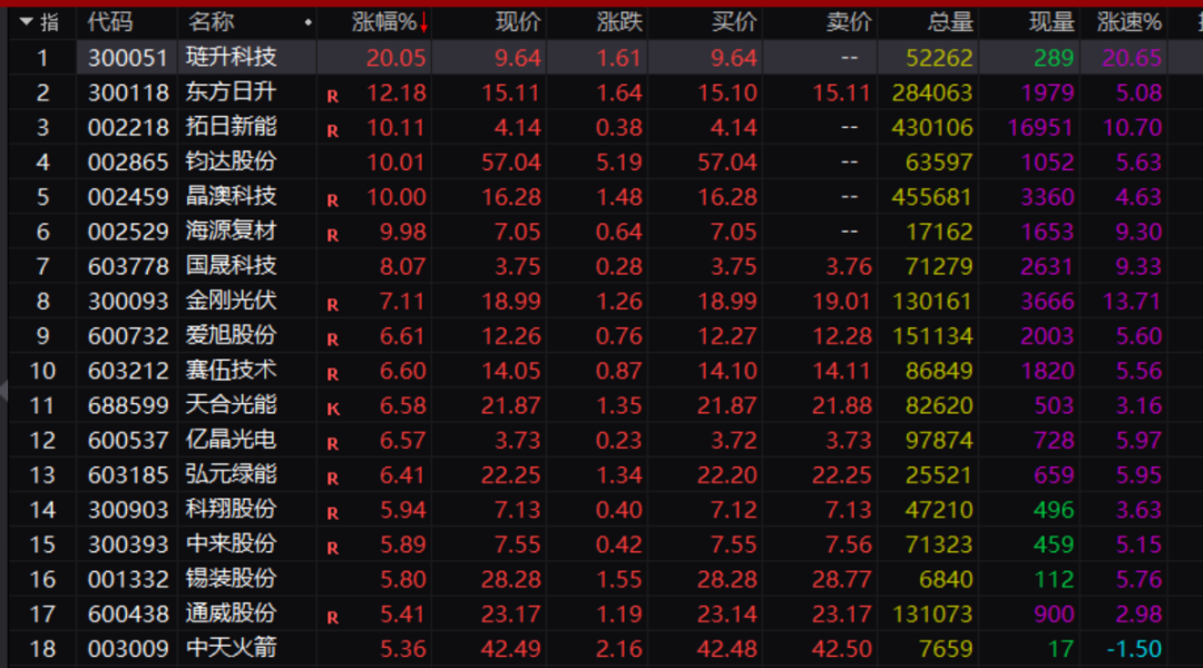今天早盘,光伏板块表现明显突出。光伏产业链全线走强,BC电池、HJT电池方向领涨。东方日升涨逾13%,拓日新能、海源复材涨停,金刚光伏逼近涨停,爱旭股份、中来股份等大涨。