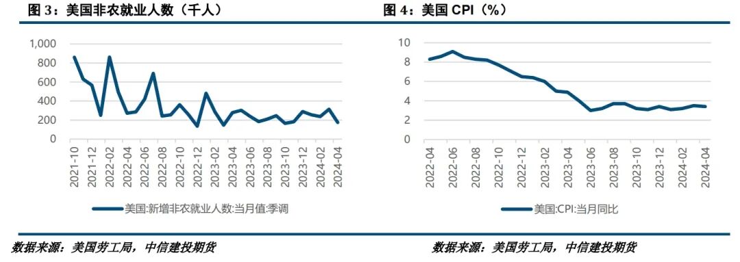美国方面,通胀担忧缓和,美联储官员持续表达耐心等待降息时机的观点。美国4月CPI同比增长3.4%,符合市场预期,前值为3.5%;4月核心CPI同比降至3.6%,为2021年4月以来最低。通胀担忧回落的同事,美国经济数据也逐渐走弱。美国4月零售销售环比持平,此前市场预期为增长0.4%;美国5月纽约联储制造业指数下跌至-15.6,远不及市场预期的-10。美国商务部周四公布的修正数据显示,今年第一季度美国实际GDP年化季环比增长1.3%,较首次预估数据下修0.3个百分点。此外,美国4月核心PCE环比上涨0.2%,略低于预期和前值0.3%,创年内新低。4月核心PCE同比上涨2.8%,较前值持平,符合市场预期。4月消费支出意外下滑0.1%,预期为增长0.1%。芝商所美联储观察工具显示,美联储6月按兵不动的概率接近100%,9月开启降息的可能性也不到50%。美联储理事杰斐逊表示,判断通胀放缓是否会持续为时尚早,将评估最新数据、经济前景变化和风险平衡,以确定适当的政策利率立场;旧金山联储主席戴利表示,尚未获得通胀将持续下行至2%的信心;克利夫兰联储主席梅斯特称,之前预计今年会有三次降息,当前这种预期已经不再合适;美联储理事沃勒表示,他需要“再”看到几个月的良好通胀数据,才能开始降息;美联储博斯蒂克和梅斯特重申,利率将在更长时间内保持高位,强调在美联储等待更多通胀正在下降的证据之际,需要保持耐心。本周美联储还公布了月初的会议纪要,纪要显示决策者担心通胀下降进展不足,认为需要花更多时间才会有信心降息,暗示继续保持高利率的观望状态应持续更久,多名决策者有意一旦通胀风险重燃就进一步加息。