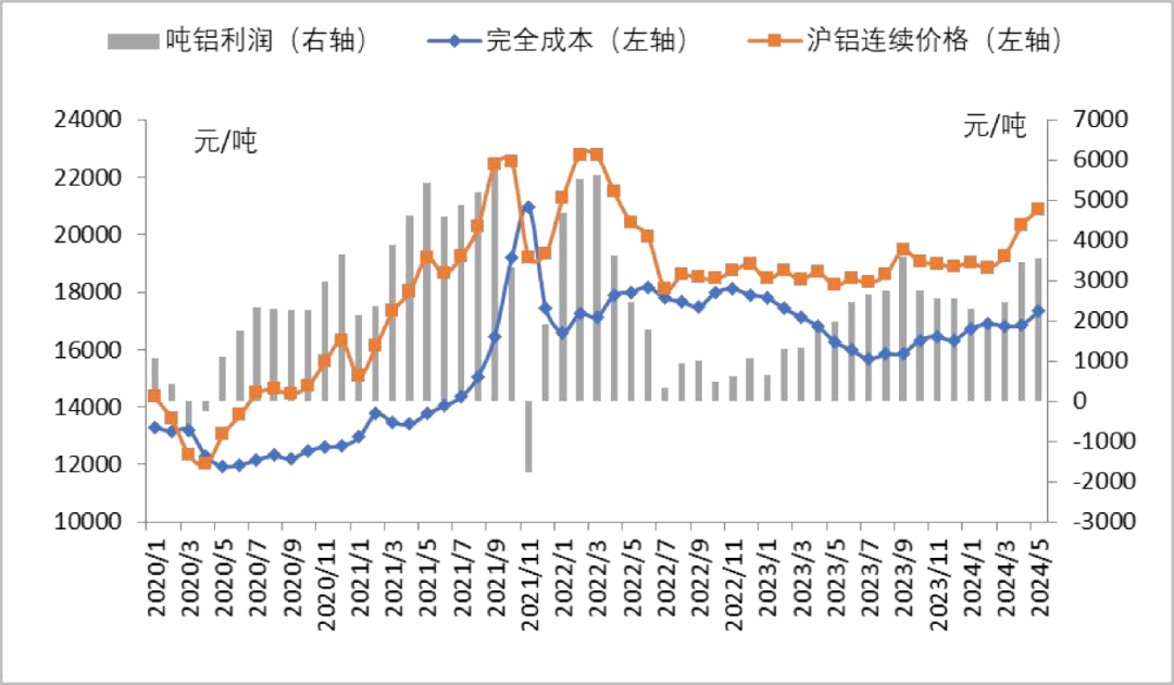 由于氧化铝价格大幅上涨,中国电解铝成本在时隔一年之后重回17000元/吨上方。根据安泰科测算,2024年5月中国电解铝加权平均完全成本(含税)为17327元/吨,环比增加472元/吨或2.8%;成本增加的同时铝价亦大幅上行,行业继续保持高盈利水平,并连续两个月实现全行业盈利。以5月份沪铝连续合约均价20877元/吨计算,当月平均利润为3550元/吨,环比增加83元/吨,同比增加1571元/吨。