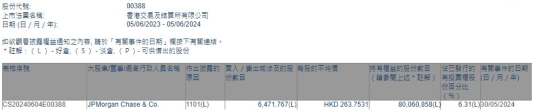 5月30日,摩根大通增持香港交易所(00388)647.1767万股,平均每股作价为263.7531港元,总金额约为17.07亿港元。增持后,最新持股数目为8006.0858万股,最新持股比例上升至6.31%。