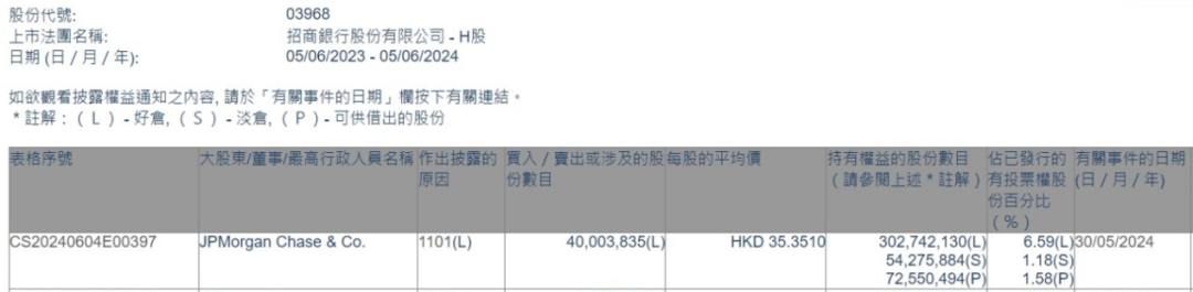 5月30日,摩根大通增持招商银行H股4000.3835万股,每股作价35.351港元,增持总金额高达14.14亿港元。增持后,最新持股数目约为3.03亿股,最新持股比例(H股的持股占比,下同)上升至6.59%。