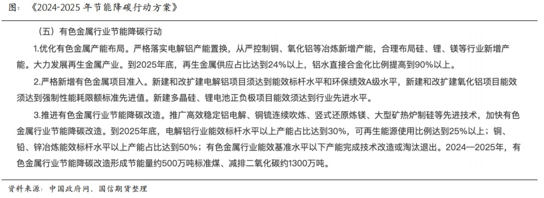 5月29日国务院印发《2024-2025年节能降碳行动方案》,方案涉及多个行业,其中,对于有色金属行业而言,方案提出以下要求:优化有色金属产能布局。严格落实电解铝产能置换,从严控制铜、氧化铝等冶炼新增产能,合理布局硅、锂、镁等行业新增产能。大力发展再生金属产业。到2025年底,再生金属供应占比达到24%以上,铝水直接合金化比例提高到90%以上。新建和改扩建电解铝项目须达到能效标杆水平和环保绩效A级水平,新建和改扩建氧化铝项目能效须达到强制性能耗限额标准先进值。新建多晶硅、锂电池正负极项目能效须达到行业先进水平。