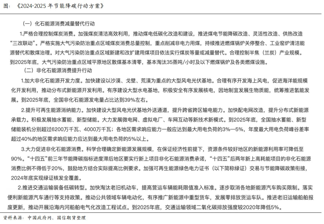可以看到,从内容上来说,此次《方案》更多是对此前提出各项目标的重申,并未提出新的内容。再考虑到此次《方案》提出的背景,2023年12月,《中华人民共和国国民经济和社会发展第十四个五年规划和2035年远景目标纲要》实施中期评估报告中指出,“单位GDP能源消耗降低、单位GDP二氧化碳排放降低2项指标实现情况滞后预期”,面临着“能源消费和二氧化碳排放增速明显快于“十三五”时期”的挑战,并对滞后于进度的指标提出,“要优化调整政策,尽最大努力推动完成规划目标。其中,对单位GDP能源消耗降低、单位GDP二氧化碳排放降低、地级及以上城市空气质量优良天数比率等约束性指标,要进一步完善能耗及碳排放强度管控政策,坚决遏制高耗能、高排放、低水平项目盲目上马,严格合理控制煤炭消费总量,大力推动重点领域节能降碳改造,加快实施主要污染物重点减排工程”的要求。