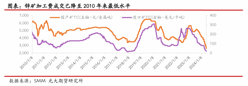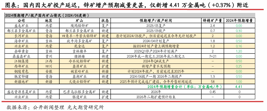 总的来看,2024年海外锌矿山减量在26.17万金属吨,增产产量在27.88万金属吨,国内精矿新增产量在4.41万金属吨,合计+6.12万金属吨(+0.51%)。而去年底,盘点后我们给的增量是在17.41万金属吨(+1.34%)。有近10万金属吨的新增量直接扣除,再外加今年欧洲Nordenham和Bubel宣布复产,冶炼产能过剩加强下,市场抢矿局面加剧,导致了精矿加工费的大幅下跌。