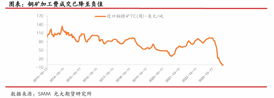 市场给予铜矿的新增产量高于锌矿,今年预期投产在78.2万金属吨(+3.55%)附近。海外减量目前盘点下来大致在-55.04万金属吨,合计增量在+23.16万金属吨(+0.97%)。ICSG则是将2024年全球铜矿产量增速调低至0.5%,低于2023年10月预测的3.7%。全球铜矿几无同比增量,而今年海外有近100万吨的冶炼产能有投产预期,市场对海外铜矿紧缺的预期甚于以往,导致从全年底巴拿马铜矿事件后铜矿加工费便一泻千里。