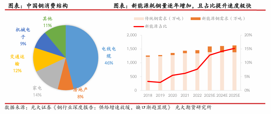 2018新能源铜需求占比仅在3%左右,但在2023年已提升至13%,新能源消费占铜消费比重越来越高。受益于两大新消费耗铜量的提升,即使未来传统需求领域增长平稳乃至于负增长,但整体耗铜量仍有正增长的预期。