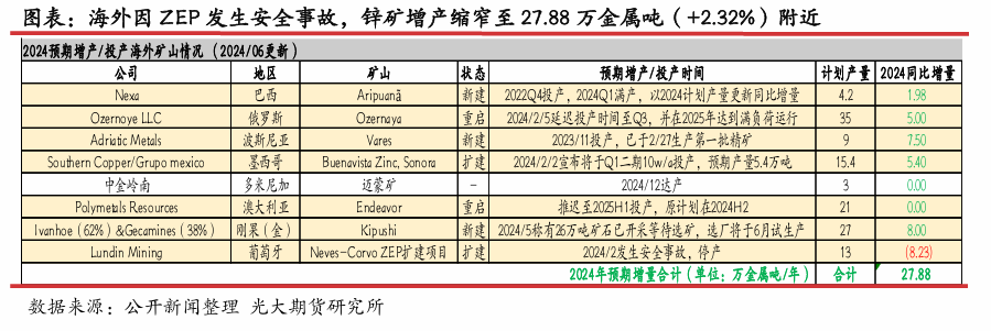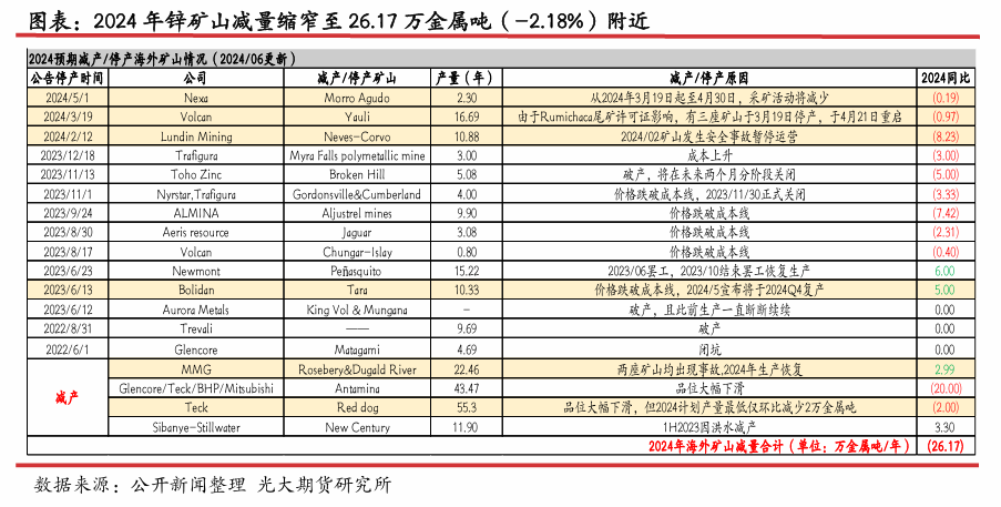 锌矿山方面,本文在去年底的基础上,更新了近半年来的新增信息,以标黄显示(下同)。锌矿山停减产上,最大两个变量是Lundin Neves-Corvo在2月因矿山事故暂停运营带来8.23万金属的减量和Boliden在5月宣布Tara将于Q4逐步复产带来5万金属吨的增量。合计来看,2024年海外矿山减量减量较去年底给出预期有所缩窄,减量在26.17万金属吨(-2.18%)附近。