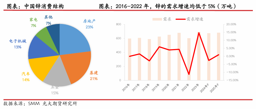 但是相较而言,锌的消费结构仍偏向于传统消费,在近年蓬勃发展的新能源领域几无建树,仍只能依靠传统房地产与基建拉动消费。并且新能源汽车车身一体化压铸铝合金趋势下,传统使用镀锌板车身厂家已在下滑。除因疫情在前一年带来的低基数外,2016-2022年,锌的需求增速均低于5%。