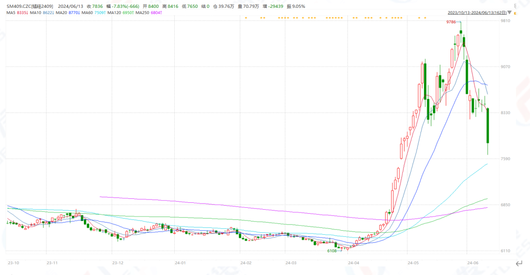 13日早间开盘,锰硅主力合约大幅减仓下行,最低触及跌停板,随后并未封板且跌幅有所收窄。截至收盘,主力合约对昨收下跌6.85%,收于7884元/吨。现货方面跟随盘面表现弱势,早间6517北方出厂在7600-8000元/吨,南方在7800-8000元/吨。
