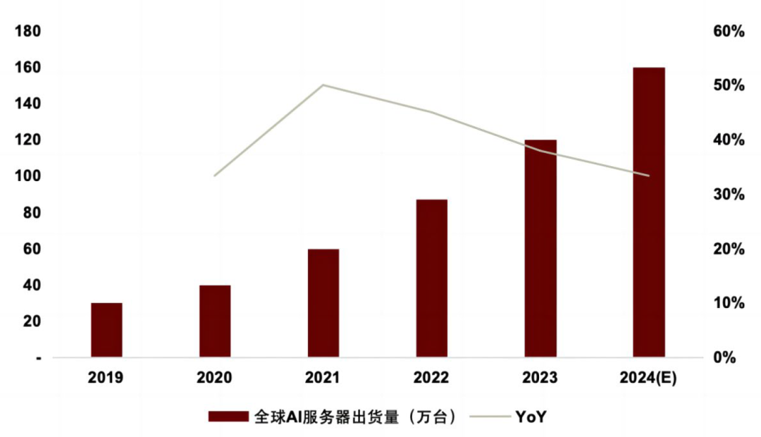 AI行情上行,高端PCB需求景气度持续上升。PCB是支撑电子元件的板状基材,AI产品中对于电子元件的使用数量增多,对于PCB产品特性、数量有较高需求:1)单个AI服务器对于数据传输速度提出更高要求,PCIe协议迭代升级需要解决信号传输损耗问题,部分高频高速领域对于高端、特殊的PCB产品有更大需求量;2)AI服务器整体出货量持续攀升,据集邦咨询预测,2024年全球AI服务器出货量将超160万台,年增长率超30%,受AI服务器带动,PCB未来有望持续受益;3)AI PC销量逐年提升,据IDC预测,2024年全球AI PC的出货量将接近5000万台,预计至2027年全球AI PC出货量超1.67亿台,占全球PC出货量约60%。AI PC需要更多高密度互连PCB及多层PCB以处理复杂计算,其特殊PCB板材制造工艺均以高层数、多层堆叠为主。此外,我们认为,AI手机的需求或将扩大对于高层HDI PCB及柔性PCB板材的需求。