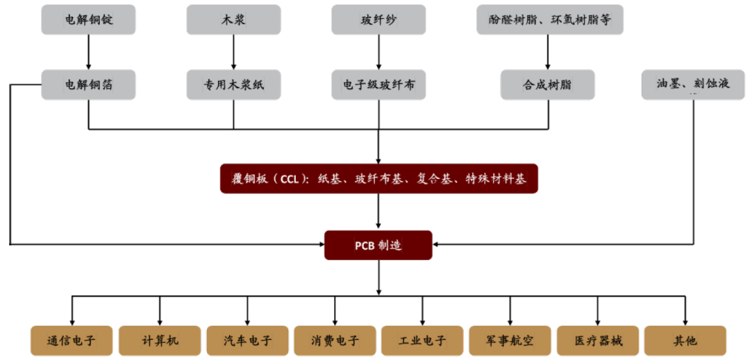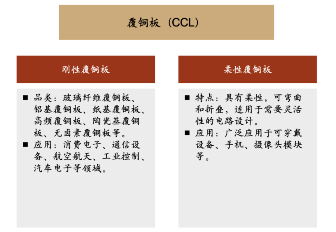 CCL(Copper Clad Laminate,亦即覆铜板)是制作PCB的基本材料。其制作工艺为用木浆纸或电子级玻纤布等作增强材料,浸以环氧树脂,单面或双面覆以铜箔,经热压而成的一种产品,是电子工业的基础材料。CCL作为印制电路板制造中的基板材料,对PCB主要起互连导通、绝缘和支撑的作用,对电路中信号的传输速度、能量损失和特性阻抗等有很大的影响。覆铜板按其基材类型可分为:刚性覆铜板、柔性覆铜板及特殊基材覆铜板,刚性覆铜板中又分为玻纤布基覆铜板、纸基覆铜板、金属基覆铜板。