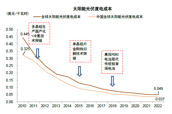 图表13:光伏关键技术突破带动成本快速下降