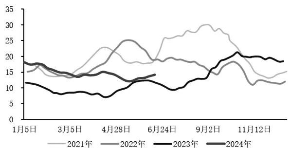 最后,下游复苏斜率偏弱。5月铜价上涨后,终端消费增速环比走弱。前期增速较高的光伏装机、新能源汽车、空调等领域增速有所放缓。进入6月,虽然铜价绝对水平回落,产业刚需采购显现,但终端好转偏慢。如果铜价回落幅度有限,那么6月消费好转预期有限。