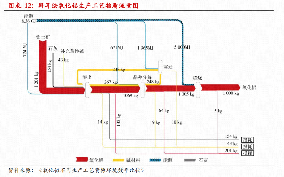 同时,铝酸钠溶液的溶出过程需要高温高压的环境,母液的蒸发环节则需要低压蒸汽,这两个环节所使用的蒸汽大约占到总蒸汽消耗量的67%。而蒸汽的产生来自燃料(主要是动力煤)燃烧,会产生二氧化碳。在氢氧化铝焙烧过程中,焙烧炉所使用的燃料主要是重油、煤气、天然气等,也会产生大量的二氧化碳排放。蒸汽和焙烧燃料占到整个氧化铝生产过程能耗的80%以上。