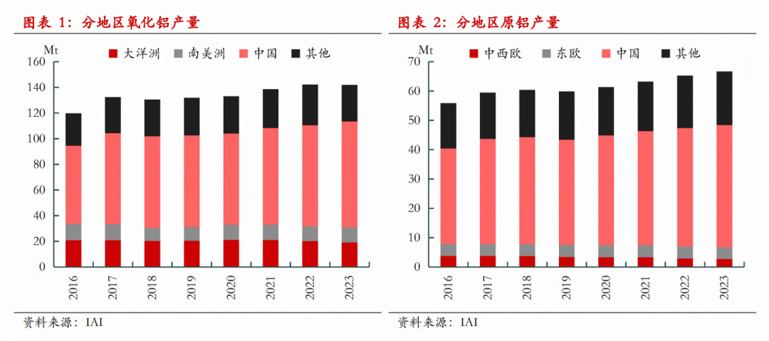 由于资源丰富、应用广泛,铝是全球生产和消费量最大的有色金属品种,铝冶炼也是全球最大的有色金属工业活动。我国是全球最大的铝生产和消费国,根据IAI数据,2023年全球氧化铝和原铝产量分别为1.42亿吨和7,059万吨,我国产量占比分别为58%和59%。