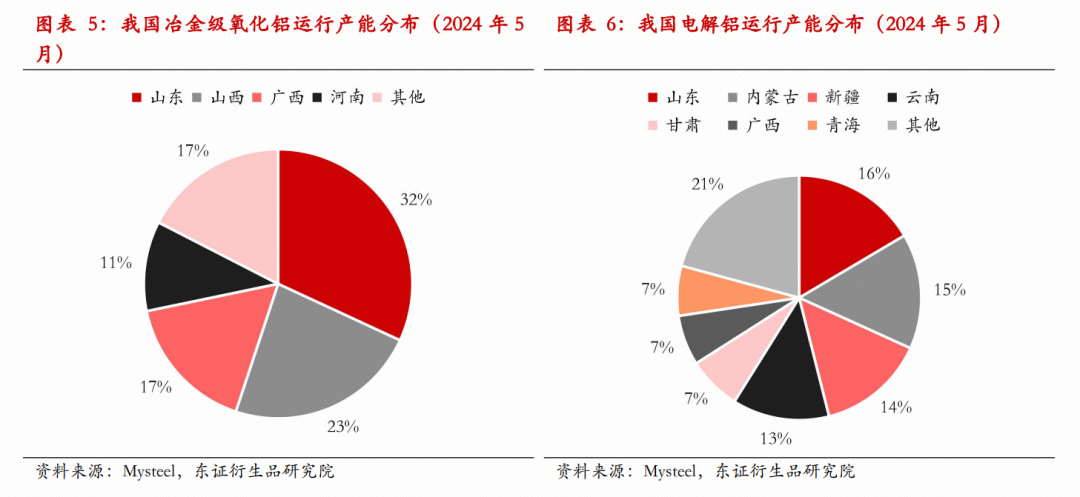 由于政策严格管控,我国氧化铝和电解铝建成产能已基本达到峰值,其中电解铝建成产能已基本接近合规产能上限。从国内产能分布来看,我国氧化铝产能主要分布在山东、山西、广西、河南等地,电解铝产能则主要分布在山东、新疆、内蒙古、云南等地。