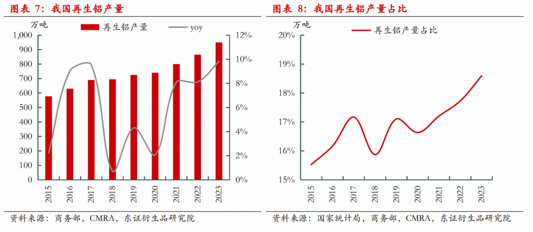 铝价值链包括铝土矿开采、氧化铝生产、原铝或再生铝生产、终端产品生产以及回收利用等全过程。由于能耗强度和碳排放强度均较低,再生铝在碳中和的背景下更具有成本优势,但由于废铝回收等政策体系尚不完善、行业存在准入门槛和技术壁垒等因素,再生铝行业的发展受到一定限制。世界再生铝产量占比超过30%,而我国目前约为18%,仍有较大的发展空间。