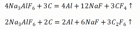 当电解质中的的氧化铝浓度低于正常值时,阳极表面含氧离子浓度会迅速降低,造成阳极过电位和槽电压相应增加,此现象为“阳极效应”。在此过程中,冰晶石熔融盐(Na3AlF6)会与炭阳极发生反应产生四氟化碳(CF4)和六氟化二碳C2F6,其全球变暖潜势(GWP)分别为6,630和11,100[ 数据来自联合国政府间气候变化专门委员会第五次评估报告(IPCC AR5报告),即四氟化碳和六氟化二碳的温室效应分别是等量二氧化碳的11,100倍和6,630倍。]。