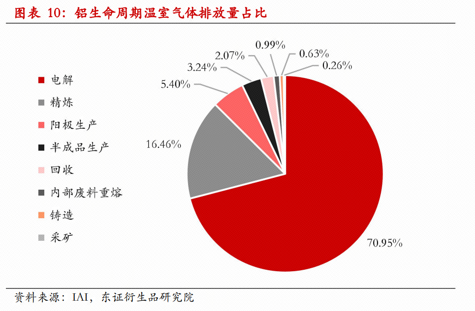 从具体的生产环节来看,电解环节的排放量占到全生命周期的约70%,其次是氧化铝精炼。电解环节的排放量主要来自于电力的间接排放,火电是原铝主产国电解消耗电量的主要来源,因此该环节碳排放强度较高。