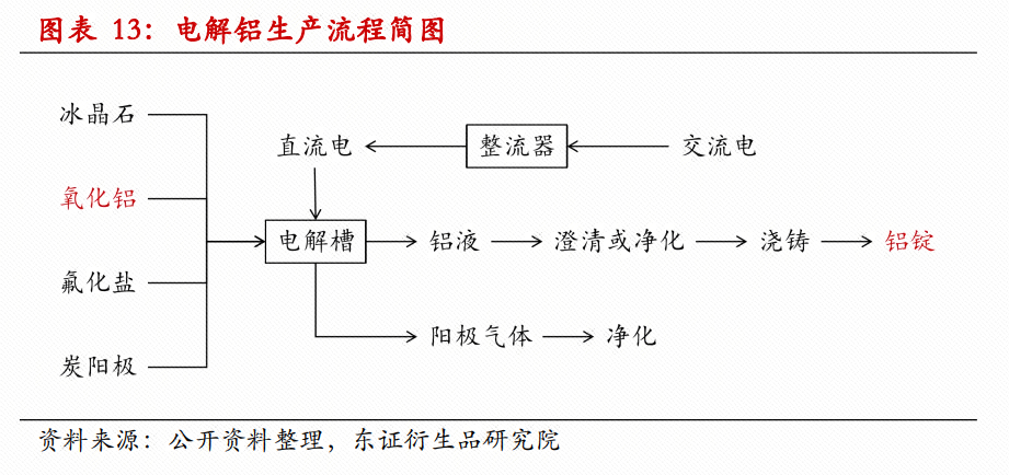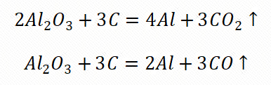 电解铝的生产普遍采用冰晶石—氧化铝熔融电解法(又称霍尔—埃鲁特熔盐电解法),在电解工序中,以氧化铝为电解质原料、冰晶石为溶剂、氟化盐等为辅料、预焙炭块作为阳极。当向电解槽中通入直流电后,即在两极上发生电化学反应,在阴极上析出铝液。