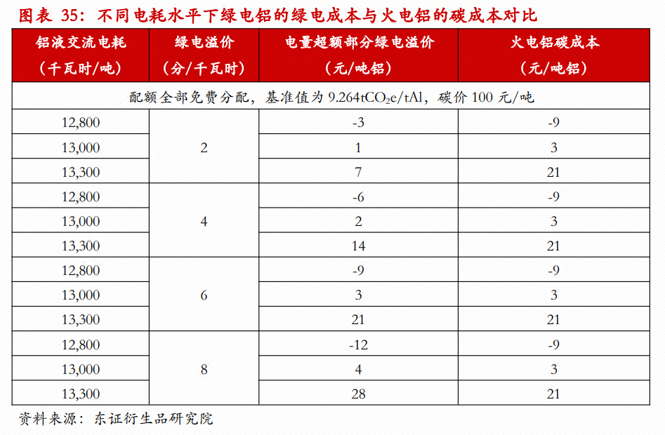 从收集的信息推算,行业配额盈余将主要集中于云铝股份、霍煤鸿骏铝电和广西来宾银海铝业等企业。建成产能超过100万吨的电解铝企业(非集团)中,在不考虑未公开的绿电交易的情况下,除内蒙古锦联铝材外,可能都将面临不同程度的配额缺口。此外,约13家企业存在足够的电耗优势,大概率不存在配额缺口。基于目前的配额分配方式,按照100元/吨的碳价计算,每吨火电铝的配额缺口成本不超过30元,当绿电溢价为6分/千瓦时时,碳成本与绿电溢价成本相当。对于电解铝主要产区,在现阶段的绿电溢价水平下,电解铝企业对绿电的需求将略强于对碳配额的需求。