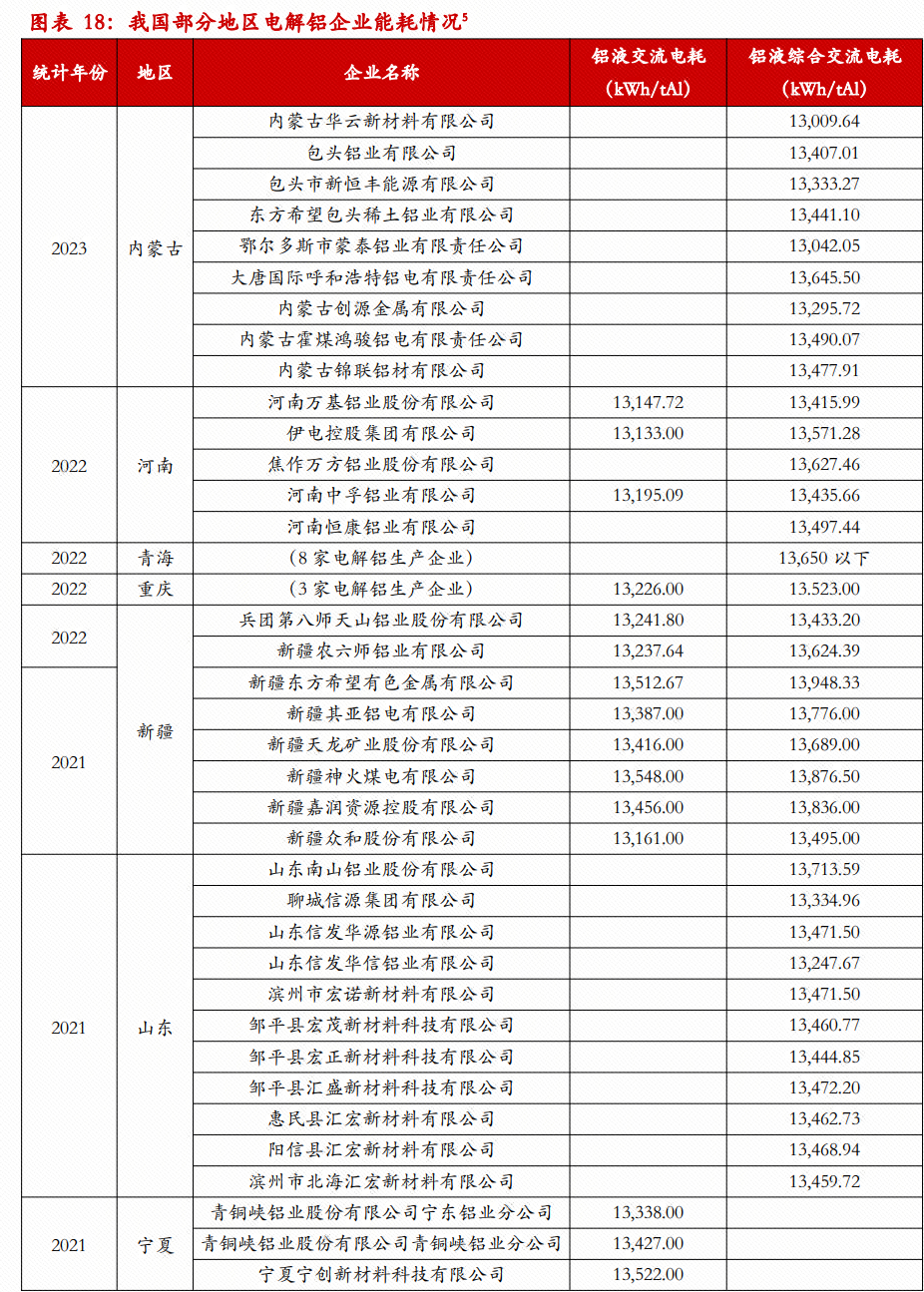 2024年4月,工信部对2023年重点行业能效“领跑者”进行公示,其中电解铝行业的“领跑者”企业为广西华磊新材料有限公司,其铝液交流电耗12,744.46kWh/t,代表了我国电解铝行业的能效先进水平。