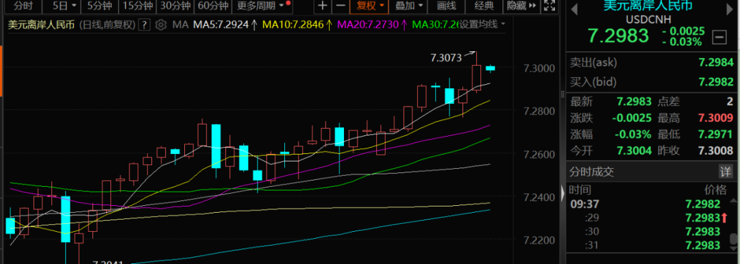 美元兑离岸人民币昨天再度突破了7.3这个关键位,而从近期走势来看,人民币近期的走势持续趋弱。权益市场亦随之走低,上证指数跌破3000点。