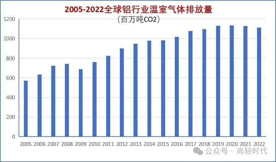 国际铝协统计数据显示,从2005年到2022年,全球铝行业温室气体排放量从5.69亿吨增长到2022年的峰值11.12亿吨,17年间年度排放量增长近一倍,累积排放量164.33亿吨。