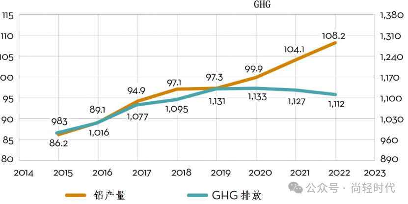 全球铝产量与温室气体(GHG)排放量(百万吨)