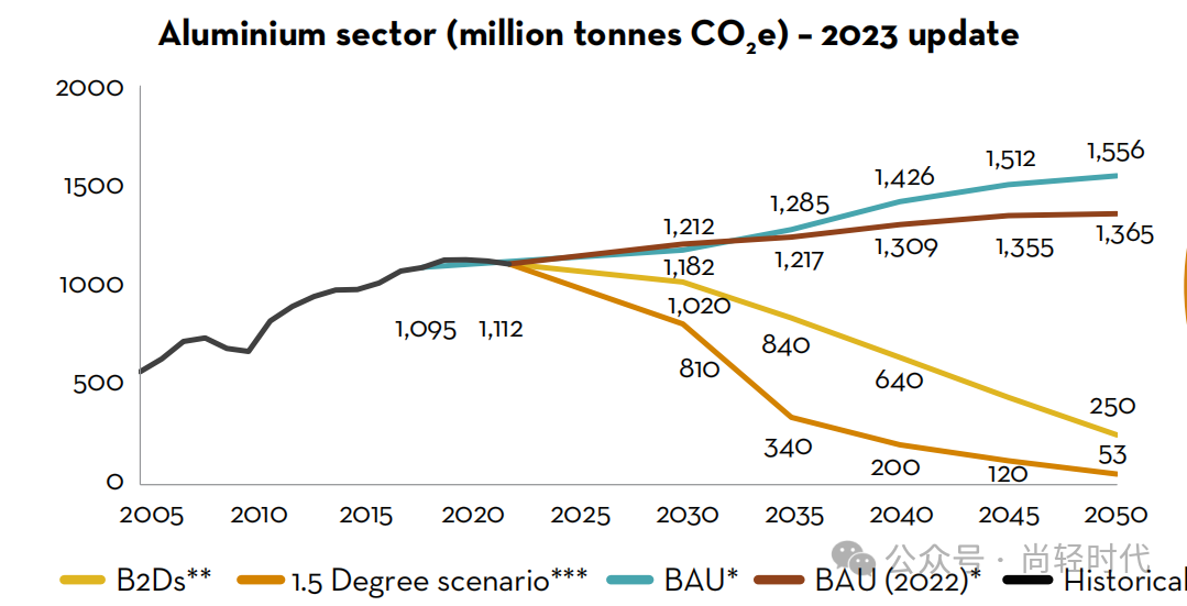 上图为国际铝协预测的到2050全球铝行业不同的温室气体排放情境。其中,BAU是依据2018年排放基准,在一切照旧的情境下的2050年的排放量,为15.56亿吨。BAU(2022)是依据2022年排放基准,在一切照旧的情境下的2050年的排放量,相比2018年的数据做了修正,有所改善。B2Ds是根据2摄氏度温升目标确定的全球铝行业减排路径,到2050年铝行业排放总量应该减少到为2.5亿吨,与2022年相比要减少77.5%的年度排放量。图中最下方的线条显示了符合1.5摄氏度温升目标要求下铝行业减排路径。经过测算,要想实现1.5度温室气体减排目标,未来28年全球给铝行业的排放额度只有150亿吨,到2050年排放重量要达到5300万吨,仅为2022年的4.8%,减排幅度将达到95.2%。
