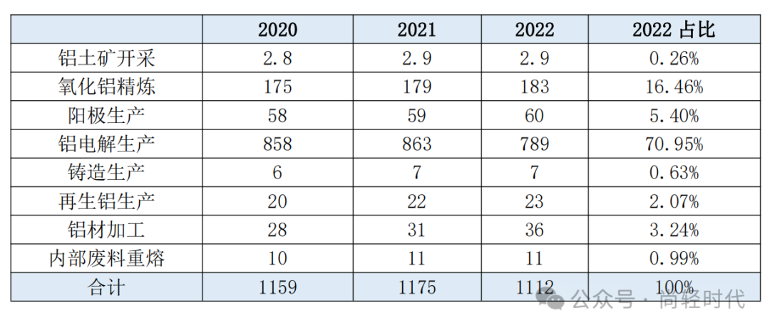 2022全球铝行业温室气体总排放量(分工序)