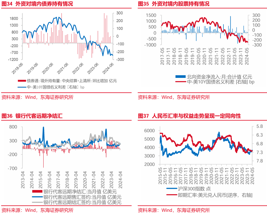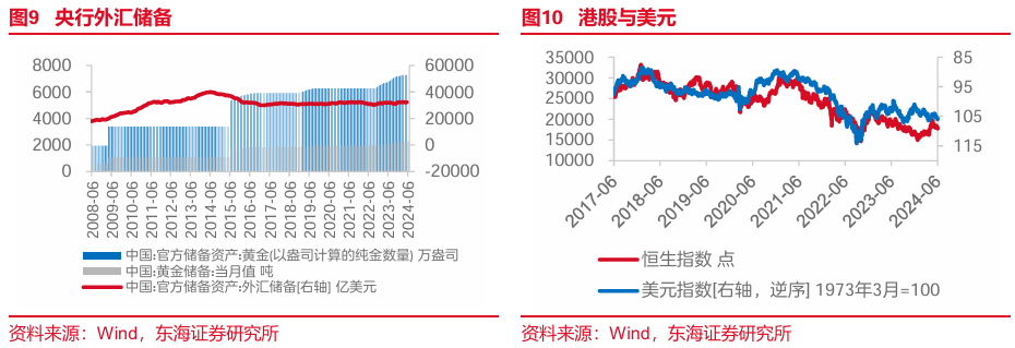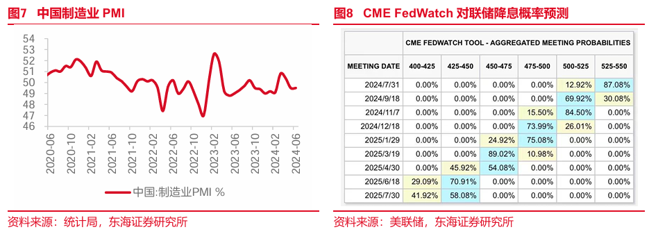 美元与美债偏鹰,约束国内权益风偏。海外方面,美元指数连续4周上行并报收105.84,对港股和A股风险偏好亦形成约束。10Y美债利率与美元联动不完全同步,但近两周亦出现反弹。10Y美债利率自6月13日低点4.20%反弹16bps至4.36%,但较5月29日的4.61%已回落25bps。汇率以对价出现,反映不同国家基本面相对强弱。作为美元指数重要构成,欧元在欧央行先行降息之下,短期相对疲软,也间接对美元构成支撑。尽管美联储当前表态偏鹰,但据CME FedWatch,市场预期美联储11月累计降息25bps及以上概率为100%,比美联储更鸽。预计全年10Y美债利率大概率围绕4%附近震荡,交易属性强于配置属性。