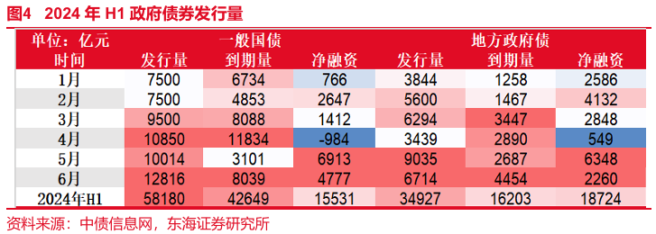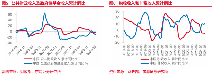 财政收支紧平衡,城投净融资收敛,已部署财政政策有望积极落地。一方面,全国一般公共预算收入下滑,但非税收入占比提升,1-5月非税收入在公共财政收入比重为16.97%,较2023年Q4升0.5pct。另一方面,1-5月份土地出让收入同比降14%。对应重点化债区域GDP合计于全国GDP占比近20%,城投境外“364点心债”融资亦受限。至6月末,城投债券境内净融资规模为-1700亿元,罕见转负。有效需求不足背景下,地方政府有望扩大支出,压降债务同时兼顾统筹稳定与发展。2024年特别国债发行提速,或边际对冲投资下行压力。